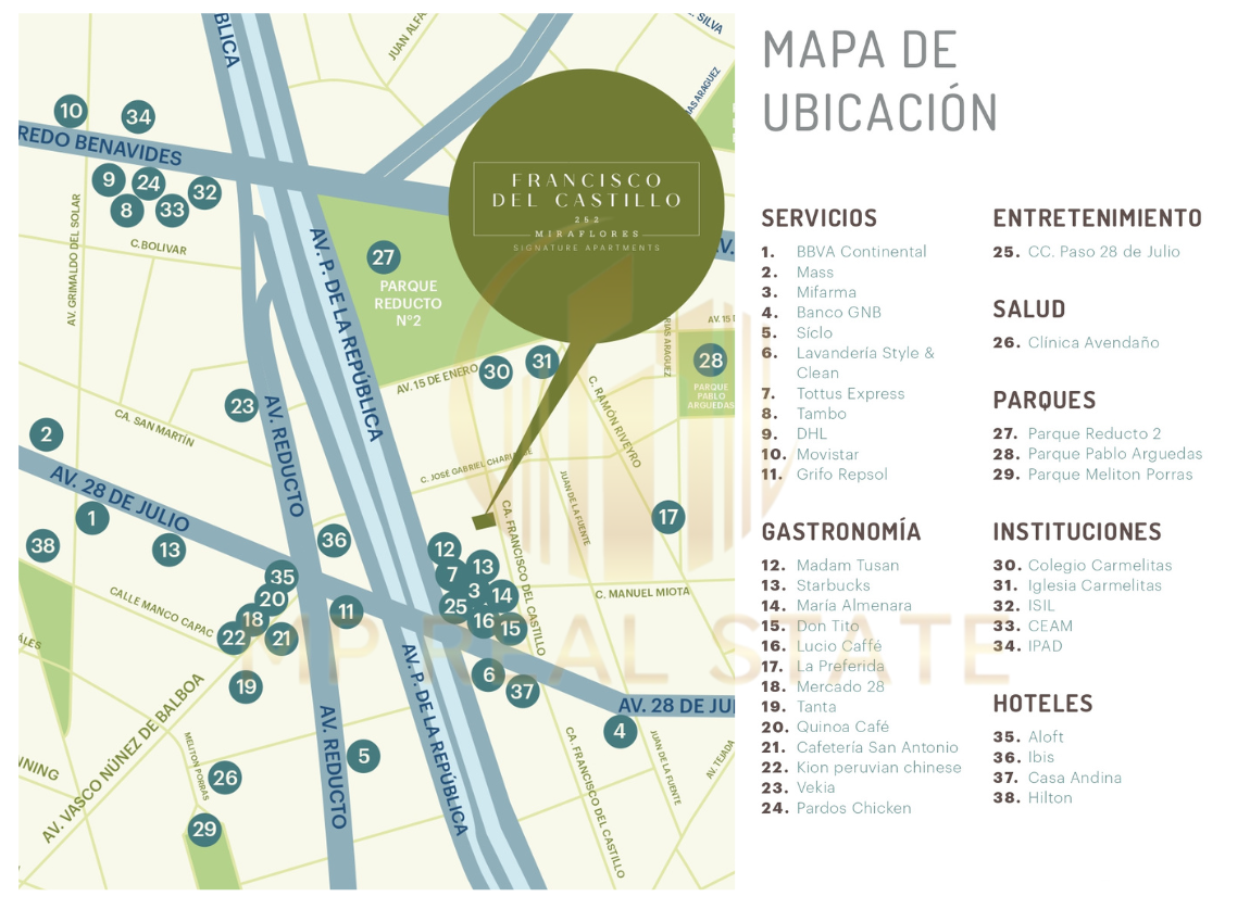 A pasos del Parque Reducto y la Vía Expresa. – Cercano a supermercados, cafés y gimnasios. – Próximo al centro de Miraflores, con acceso a su zona comercial, cultural y gastronómica.