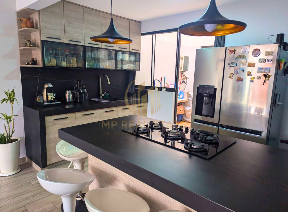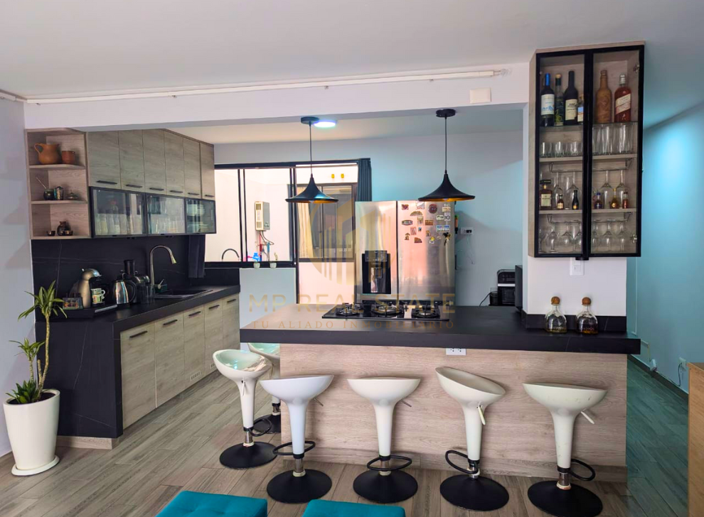 🍳 Cocina renovada con muebles bajos y un gabinete superior + barra desayunador